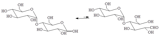 В полученном дисахариде остается один свободный полуацетальный гидроксил, за счет которого в водных растворах возможно существование таутомерных форм, т.е. восстанавливающий дисахарид в водном растворе мутаротирует.
