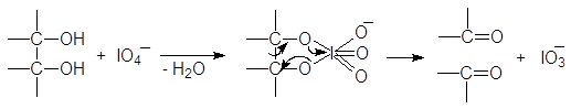 При изучении спиртов (12.3.2.2) мы видели, что периодная или метаиодная кислота окисляет гликоли с разрывом углерод-углеродной связи. Метаиодная кислота растворима в воде; ее обычно генерируют, добавляя метаперйодат калия (или натрия) к подкисленному водному раствору диола. Реакция проходит по следующему механизму: